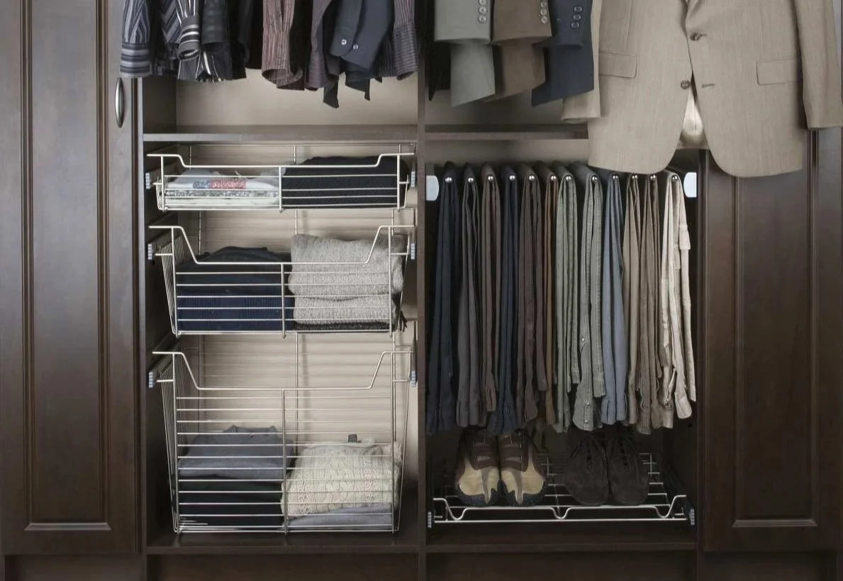 Custom walk-in Candlelight closet with Pillowtop drawers and pullout wire storage baskets in Chrome. Request a Free Consultation & 3-D Storage Design with Closets of Tulsa here.