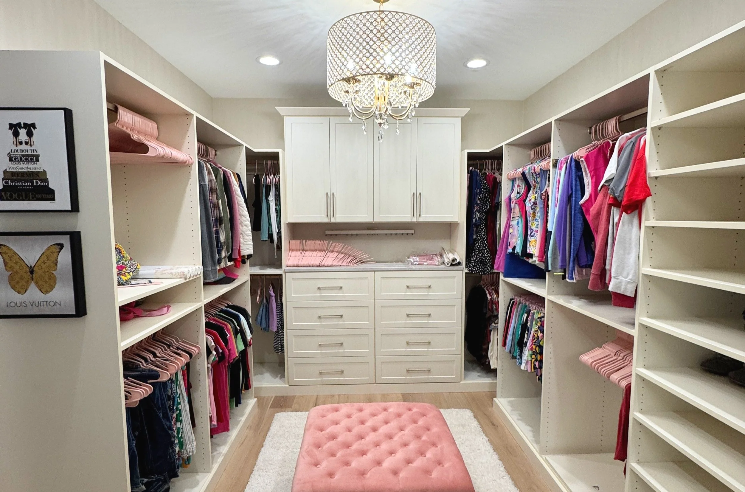 Custom walk-in closet with Cloud Allegra cabinets and Matte Gold hardware. Request a Free Consultation & 3-D Storage Design with Closets of Tulsa here.