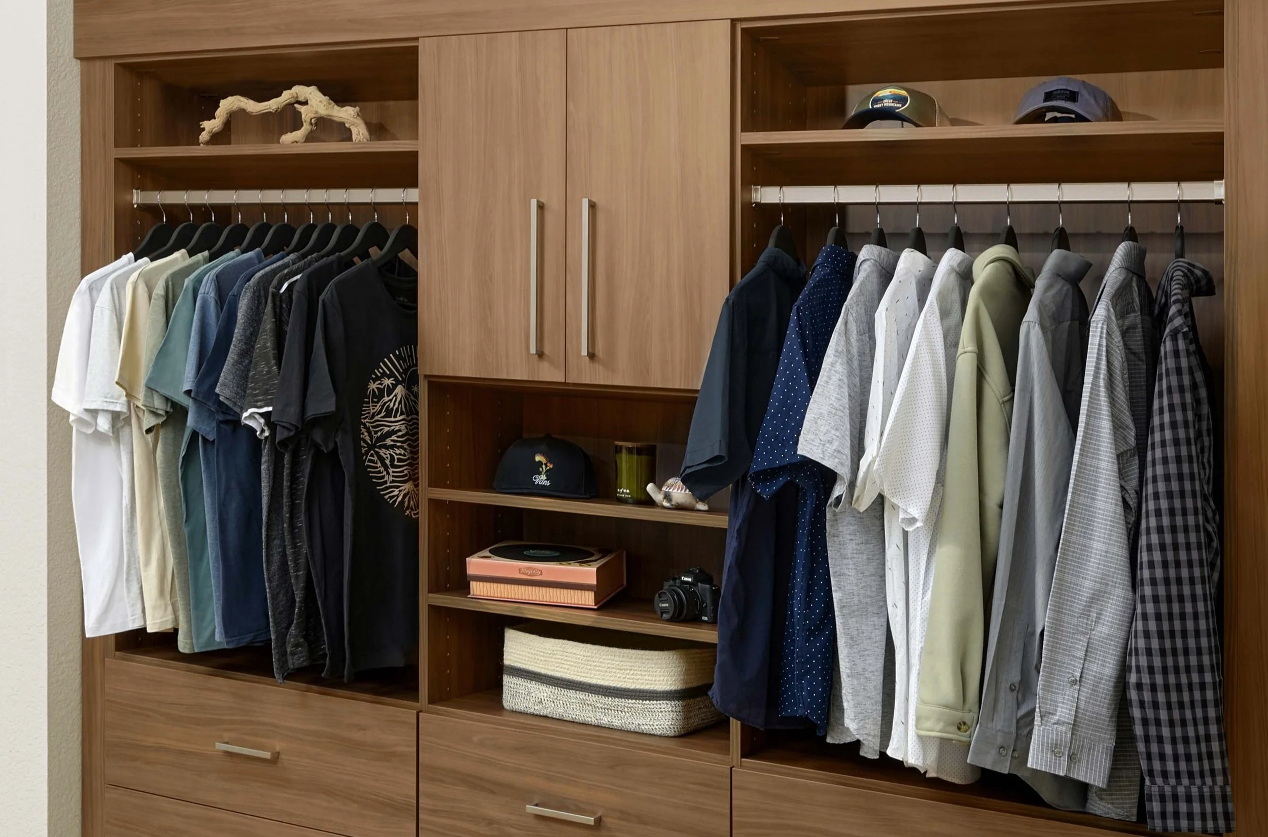 Custom walk-in closet with Licorice Flat Panel cabinets. Request a Free Consultation & 3-D Storage Design with Closets of Tulsa here.