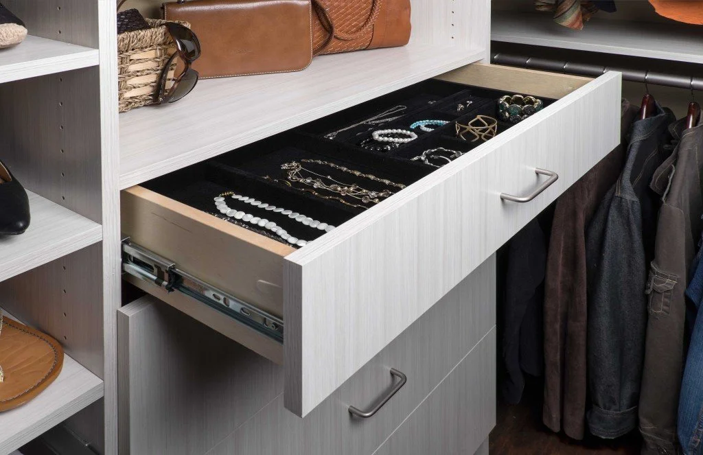 Arctic Modern closet with velvet-lined jewelry drawer. Request a Free Consultation & 3-D Storage Design with Closets of Tulsa here.