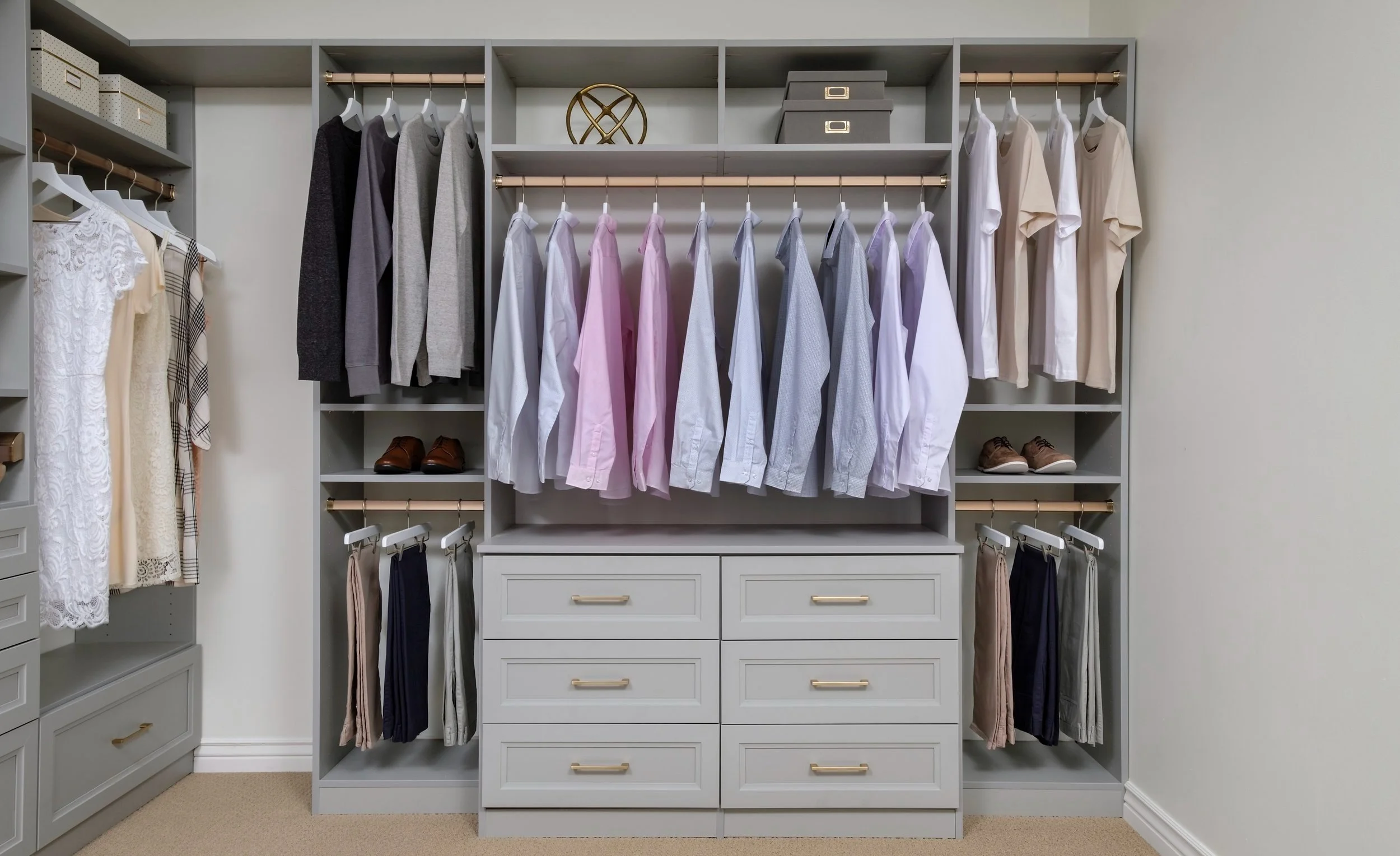 Custom walk-in closet with Concrete Flat Panel cabinets. Request a Free Consultation & 3-D Storage Design with Closets of Tulsa here.